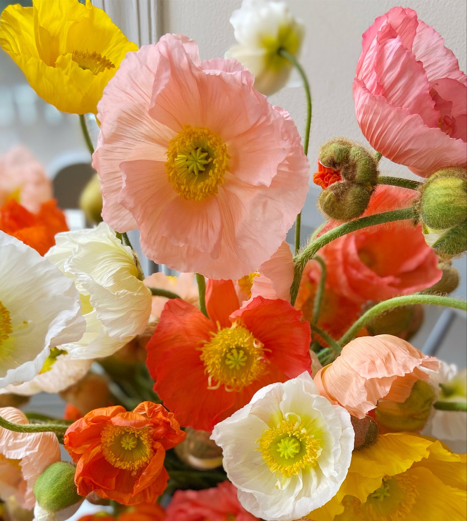 To promote the longevity of your flowers, keep them in a cool place out of direct sunlight. Trim the stems with a sharp knife or scissors when they arrive. We recommend changing the water every couple of days to keep your blooms looking fresh and perky!