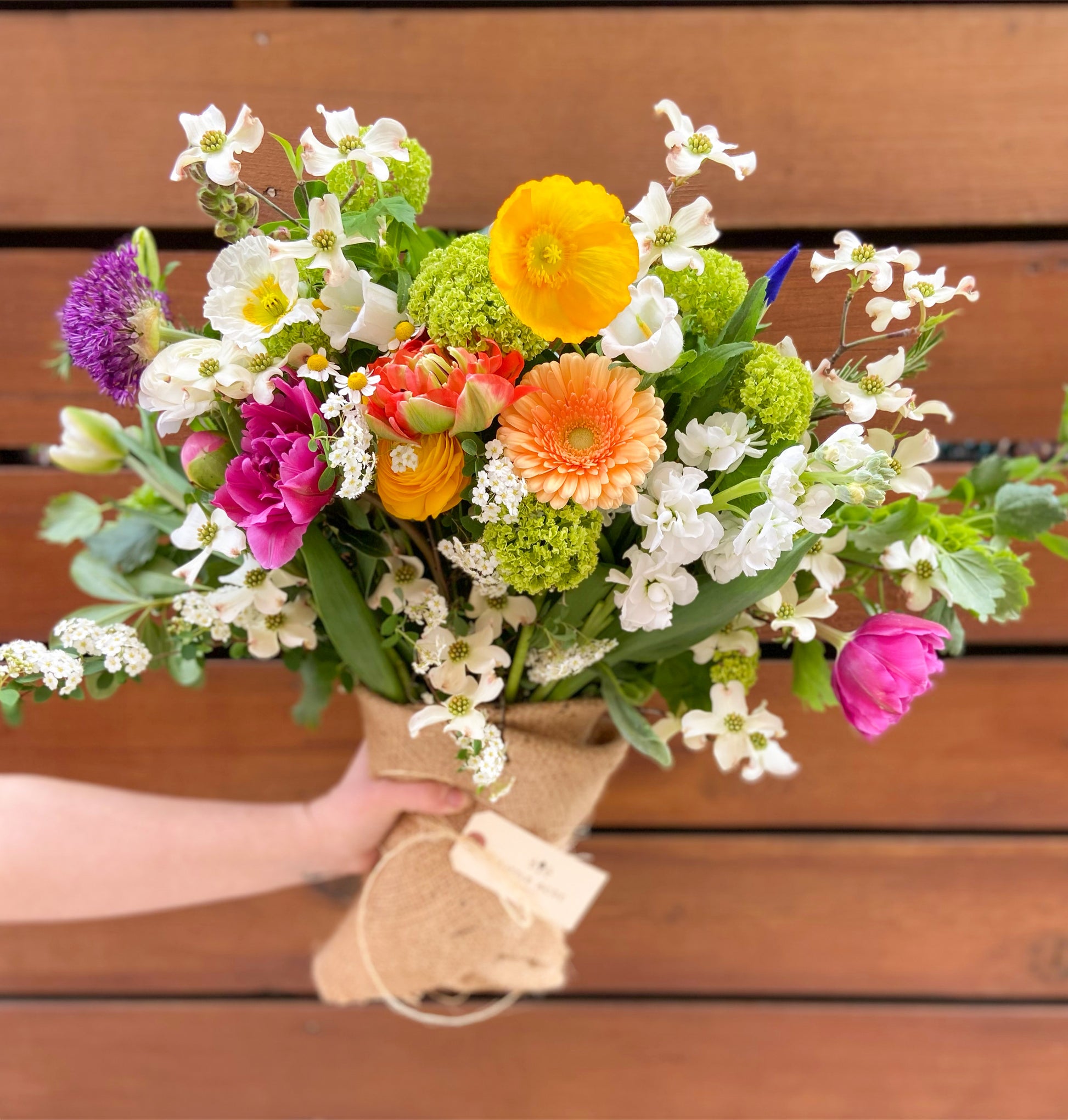 Fresh, locally sourced flowers are hand-tied in a beautiful bouquet just for you.