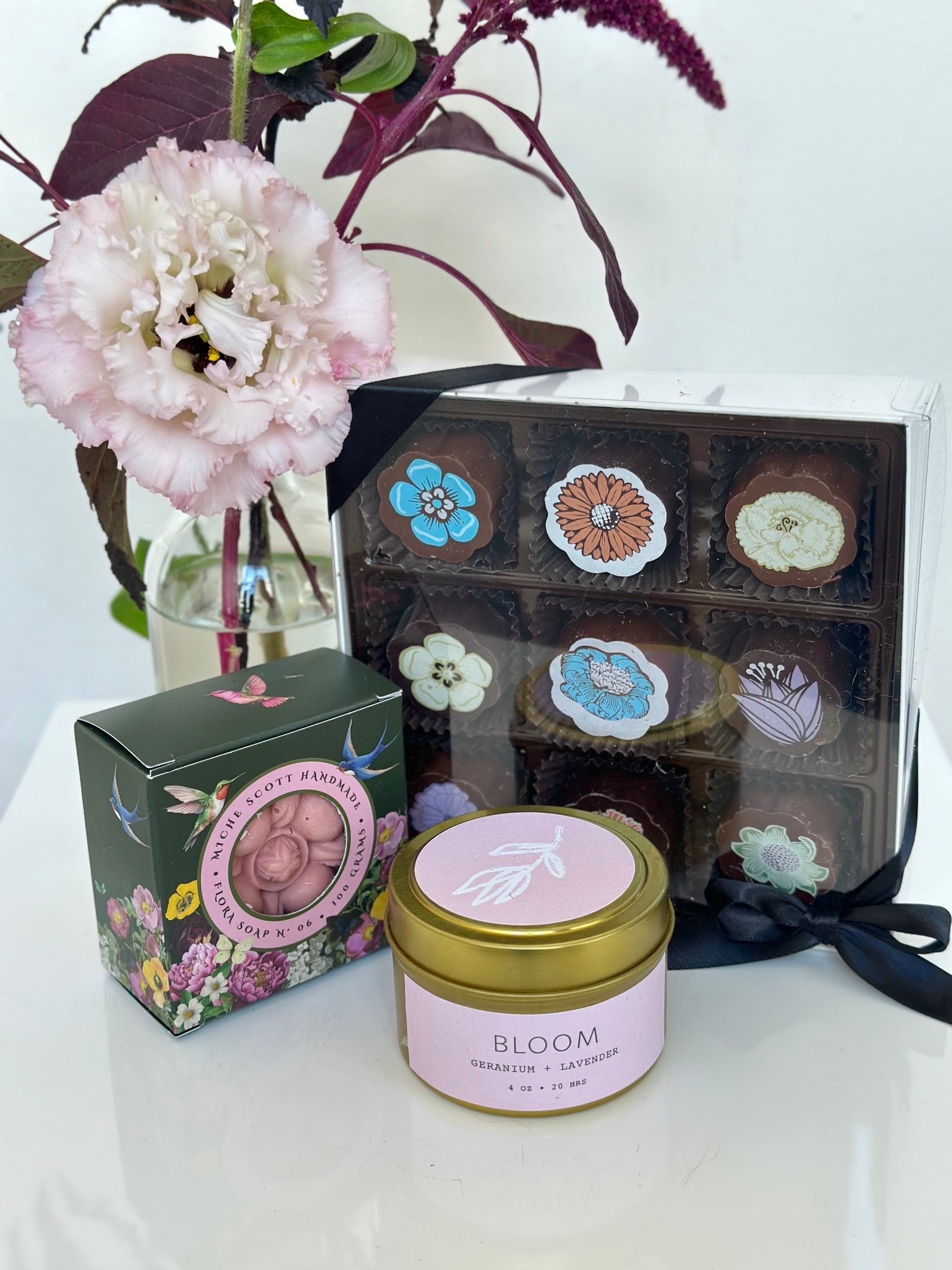 • The Love Ya Bundle includes a decadent soy candle tin from Handmade Habitat, handcrafted floral soap from Miche Scott Handmade, and a 9-piece signature chocolate box from local chocolatier Chouquette.