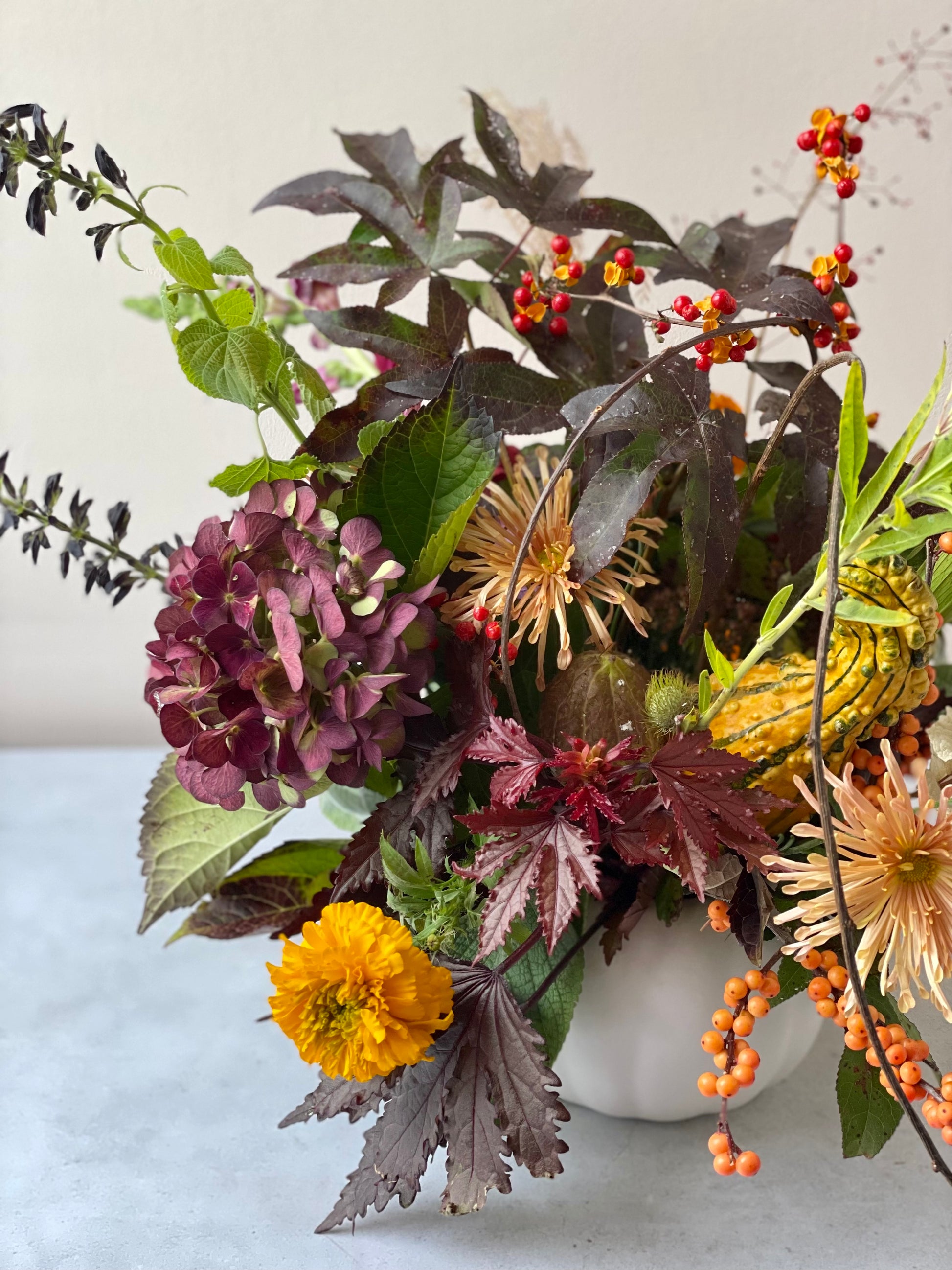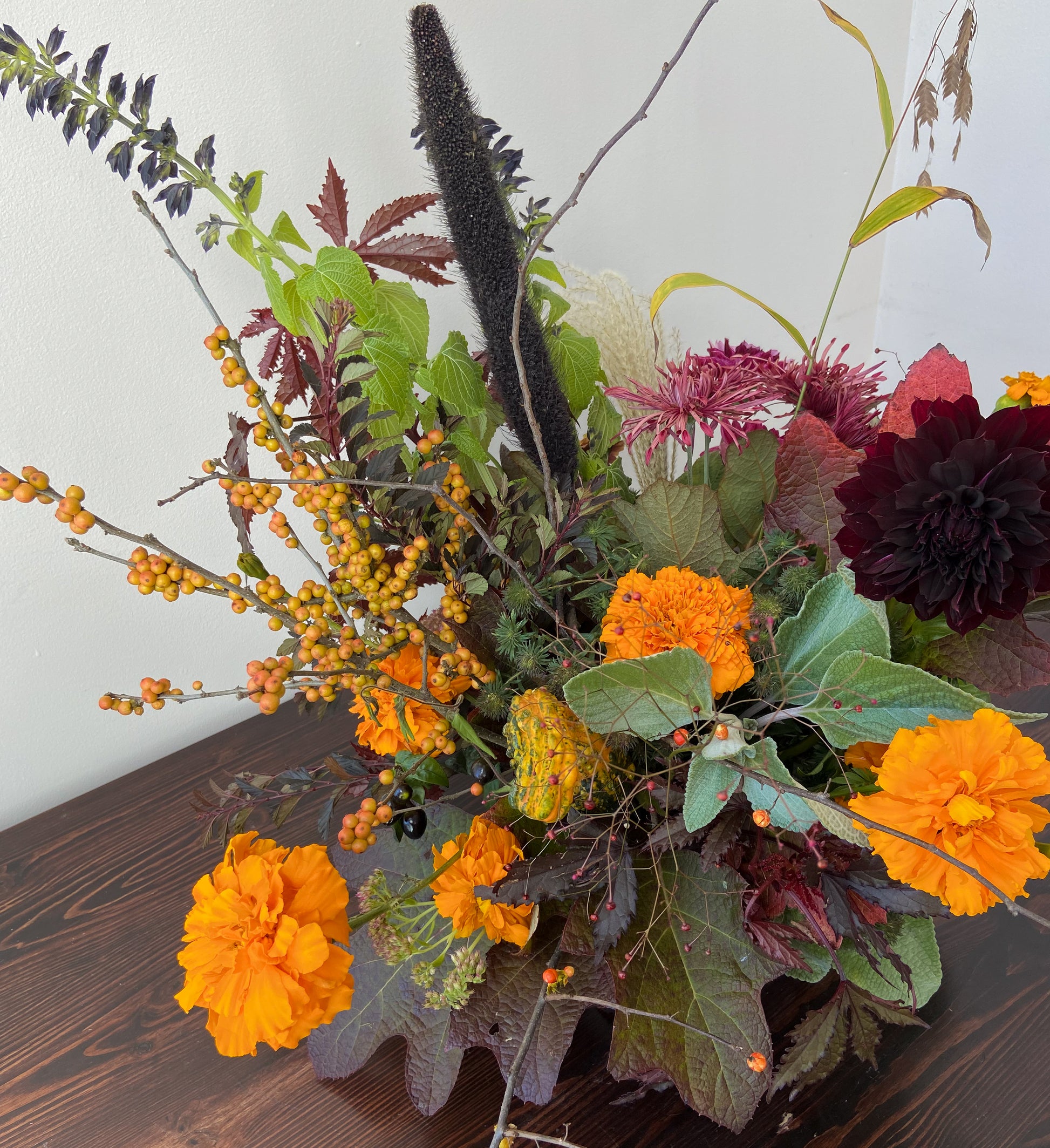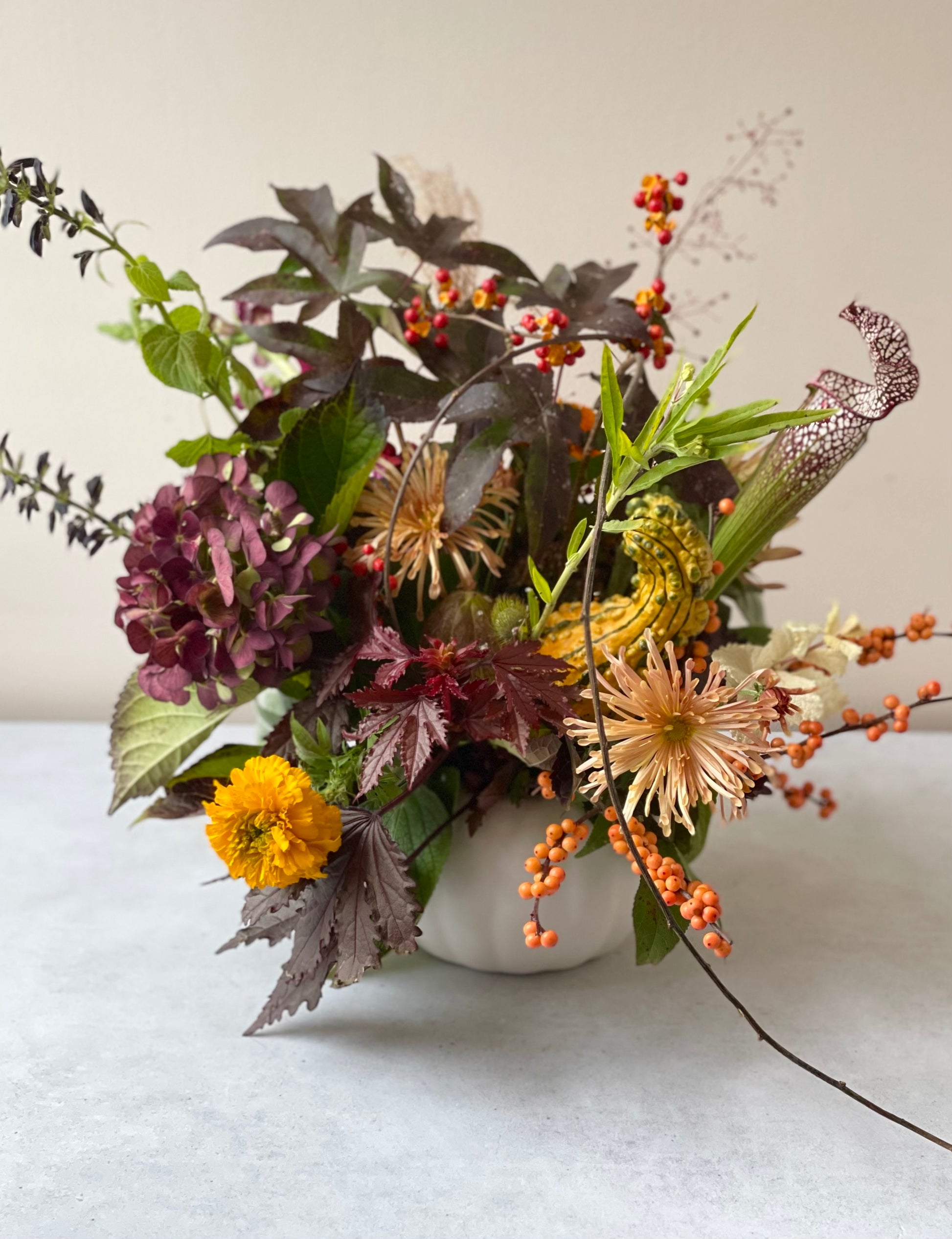 Just in time for your Halloween extravaganza: the creepiest blooms on the block! Designed into a white matte pumpkin vessel (perfect to repurpose for your Halloween candy!), this design features a moody Halloween-inspired color palette, and includes dahlias, heirloom mums, marigolds and some weird & wonderfully unique local varietals.