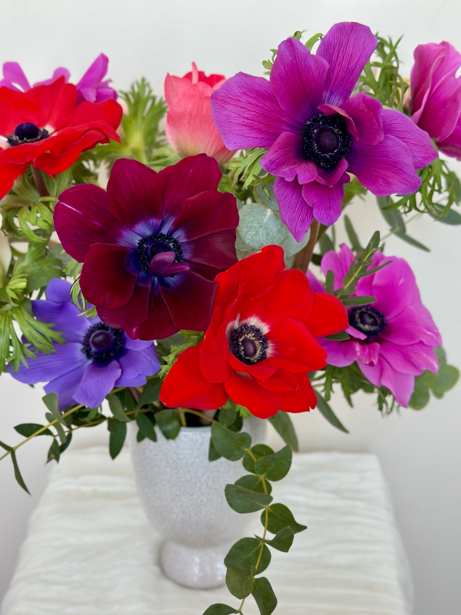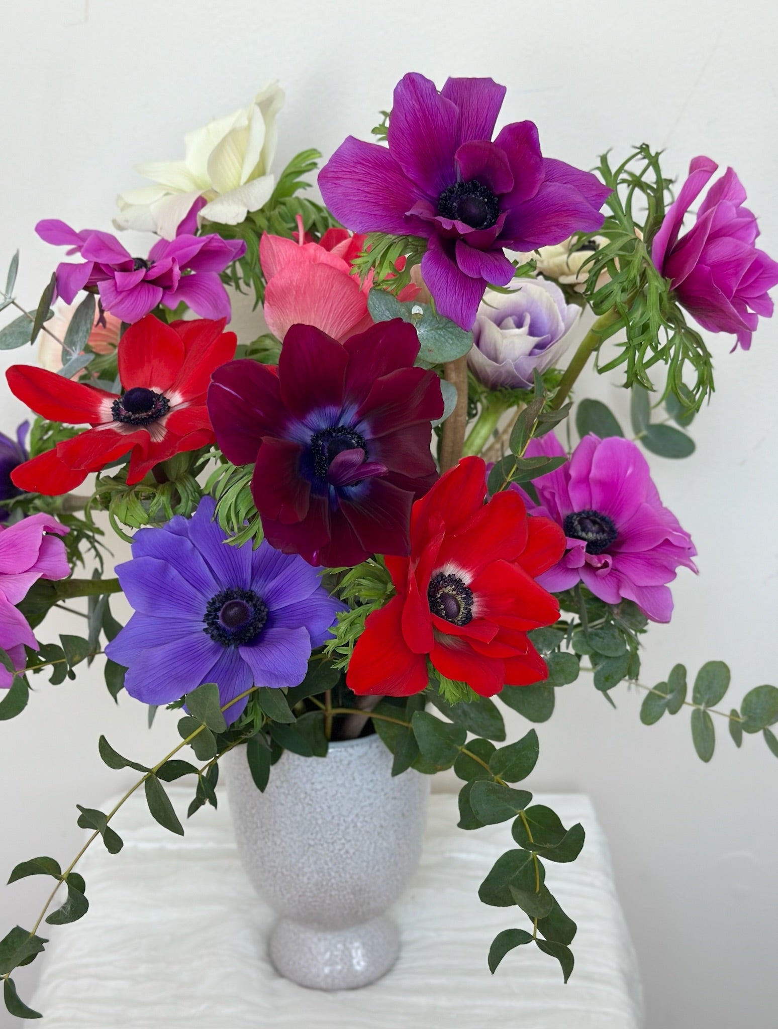 - Enjoy 15 stems of anemones (and accents of local eucalyptus) in mixed colors artfully displayed in a white footed vase. A totally fun and unique design!